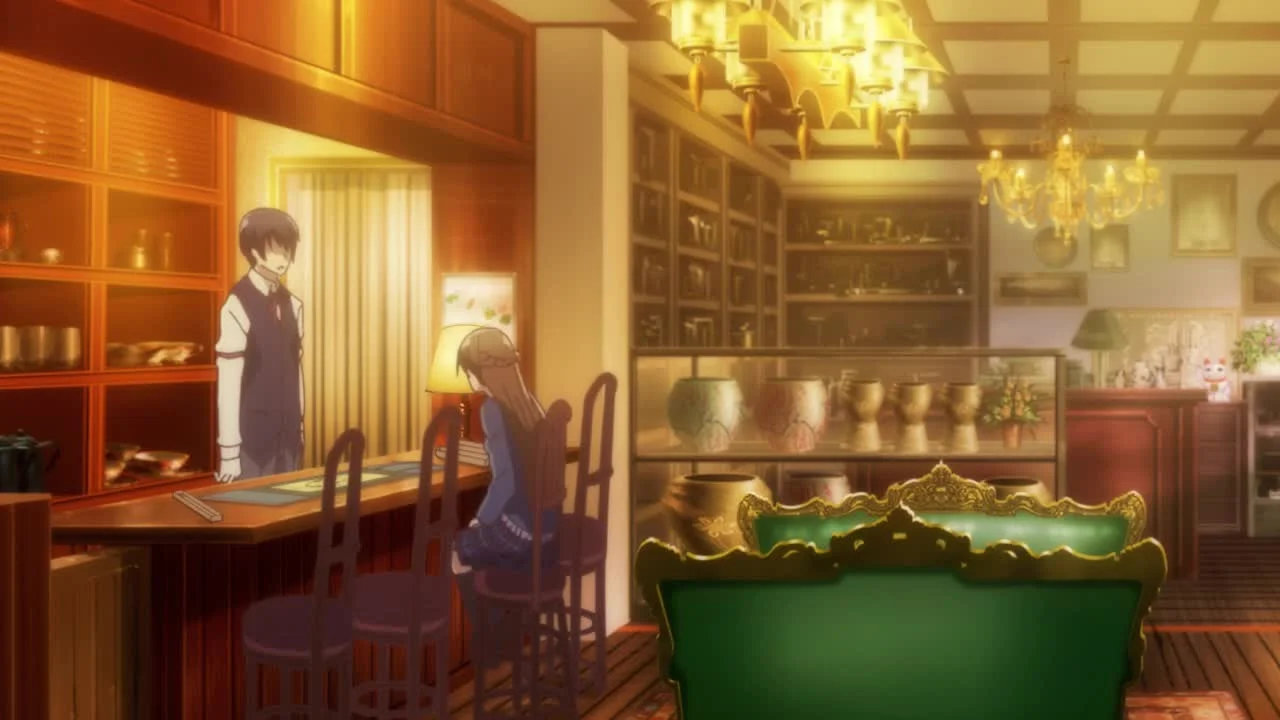 Там она знакомится с Китаёки, сыном владельца лавки, что приводит к их длительной, увлекательной беседе. Вдохновленный знаниями Аой, Китаёки предлагает ей работу по вечерам, и девушка с радостью принимает приглашение. Новое занятие позволяет Аой не только углубить свою страсть к изучению старых вещей, но и делиться своими познаниями с посетителями магазина. Постепенно между Аой и Китаёки завязывается крепкая дружба, а совместная работа наполняет их дни захватывающими открытиями из мира антиквариата.